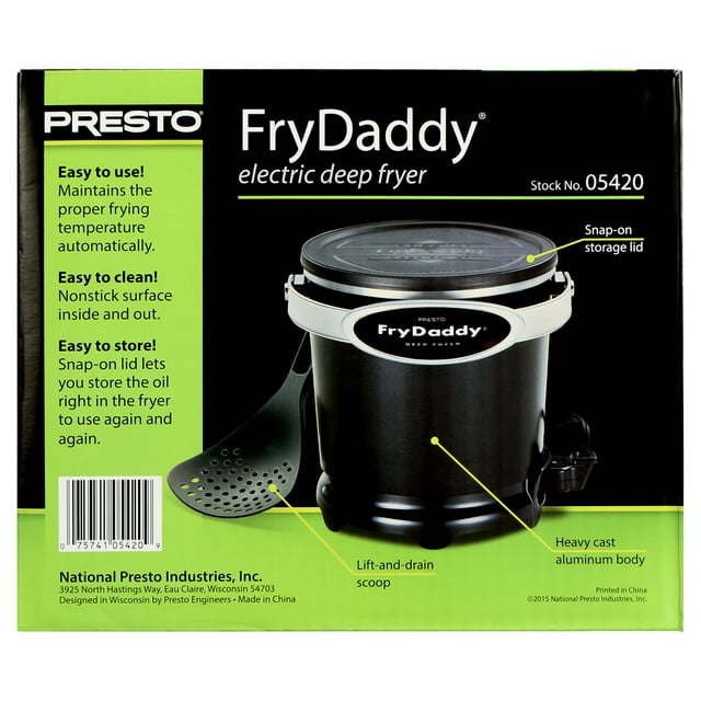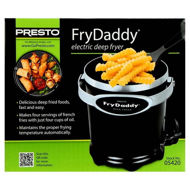 Presto FryDaddy Electric Deep Fryer 05420Makes four servings of french fries with just four cups of oilMaintains proper frying temperature automaticallyFries crispy shrimp, chicken, onion rings and moreCeramic nonstick surface—PFAS-freeHandy scoop lifts, drains, and servesQuick preheat time and oil temperature recoveryEasy to clean, nonstick surface inside and outSnap-on lid stores oil without spills or odor9.0" W x 8.31" D x 7.43" H, weight 3.2 lb